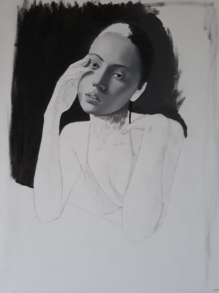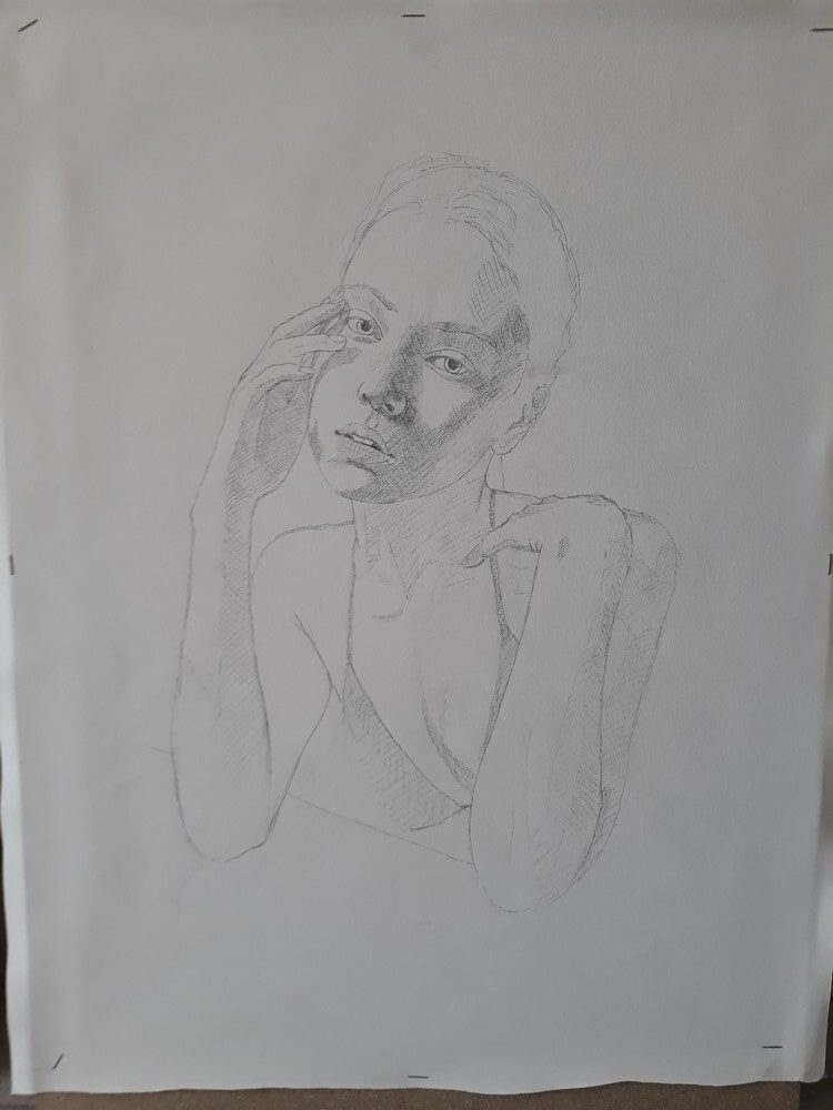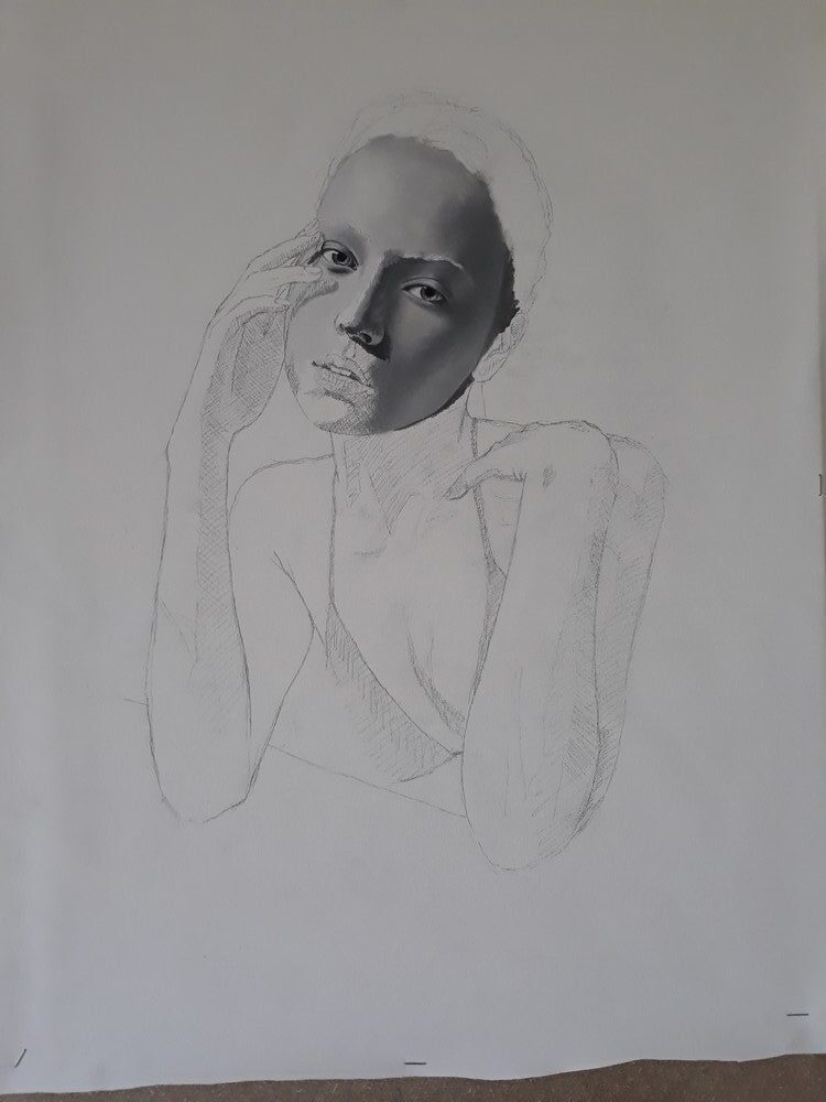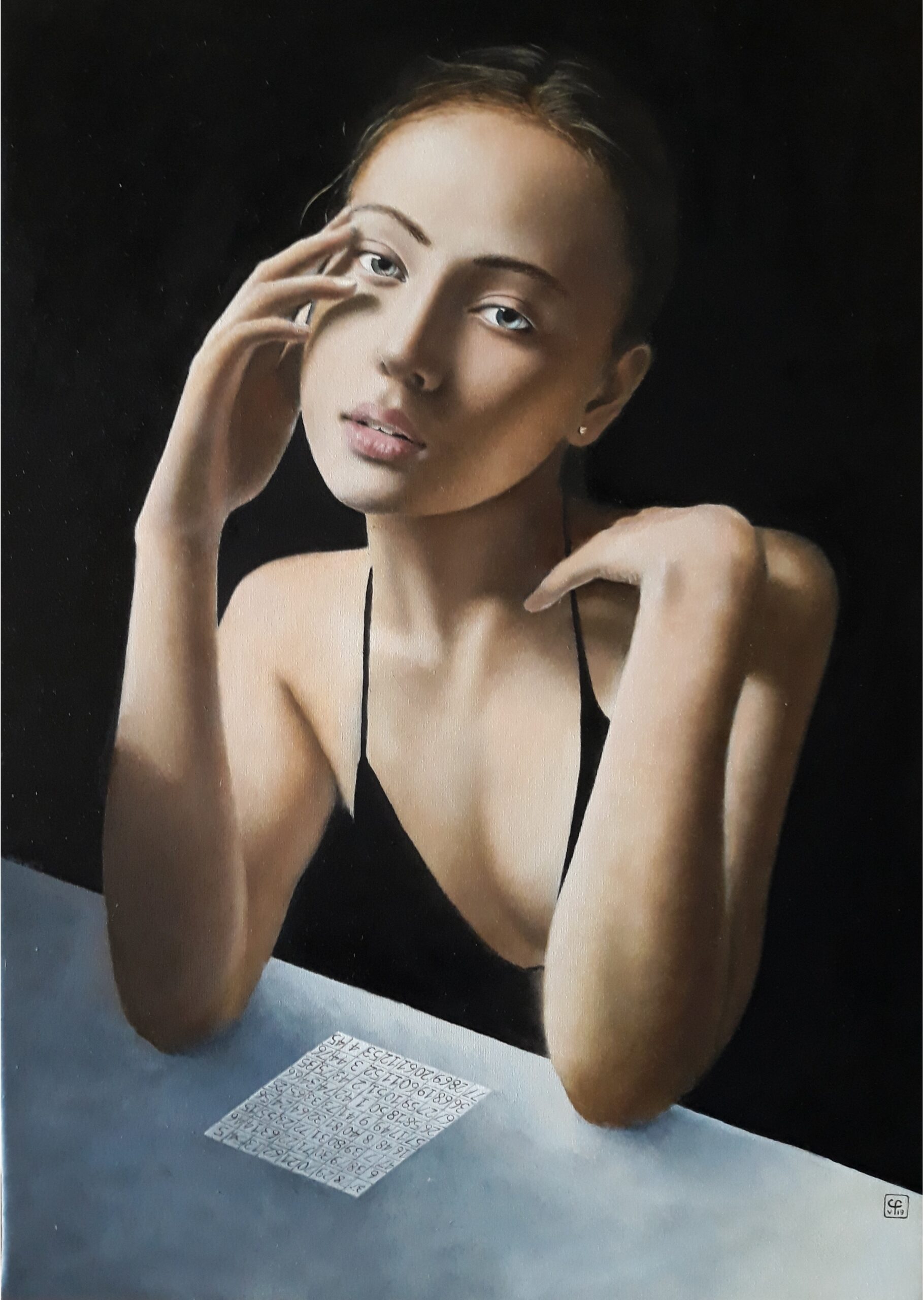 La modella raffigurata poggia i gomiti su un piano su cui è poggiato un foglio che raffigura un quadrato magico a base 9: il quadrato della Luna.